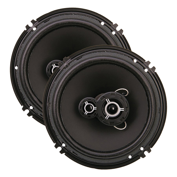 SPECS: • 300 watts max power, 100 watts RMS; 4 ohms impedance;• Use to replace blown-out or tired OEM 6.5-in. factory speakers;• Frequency response: 80 Hz to 20 kHz;• Efficiency: 89 dB (1w/1m dB);• Injected-molded polypropylene cones with treated woven cloth surround;• 1-in. voice coil on aluminum former; 1-in. balanced dome Mylar(R) tweeter and 1/2 in. dome super tweeter;• Quick-disconnect terminals;• Woofer mounting depth: 3.125 in.;• Includes grilles, installation parts, and manual;• Pair;